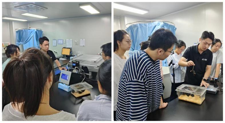 下午刘艳老师及江苏赛昂斯生物科技有限公司工程师带领学员针对小鼠跑步机、Morris水迷宫、抓力测试仪以及步态分析仪进行了演示和实操。